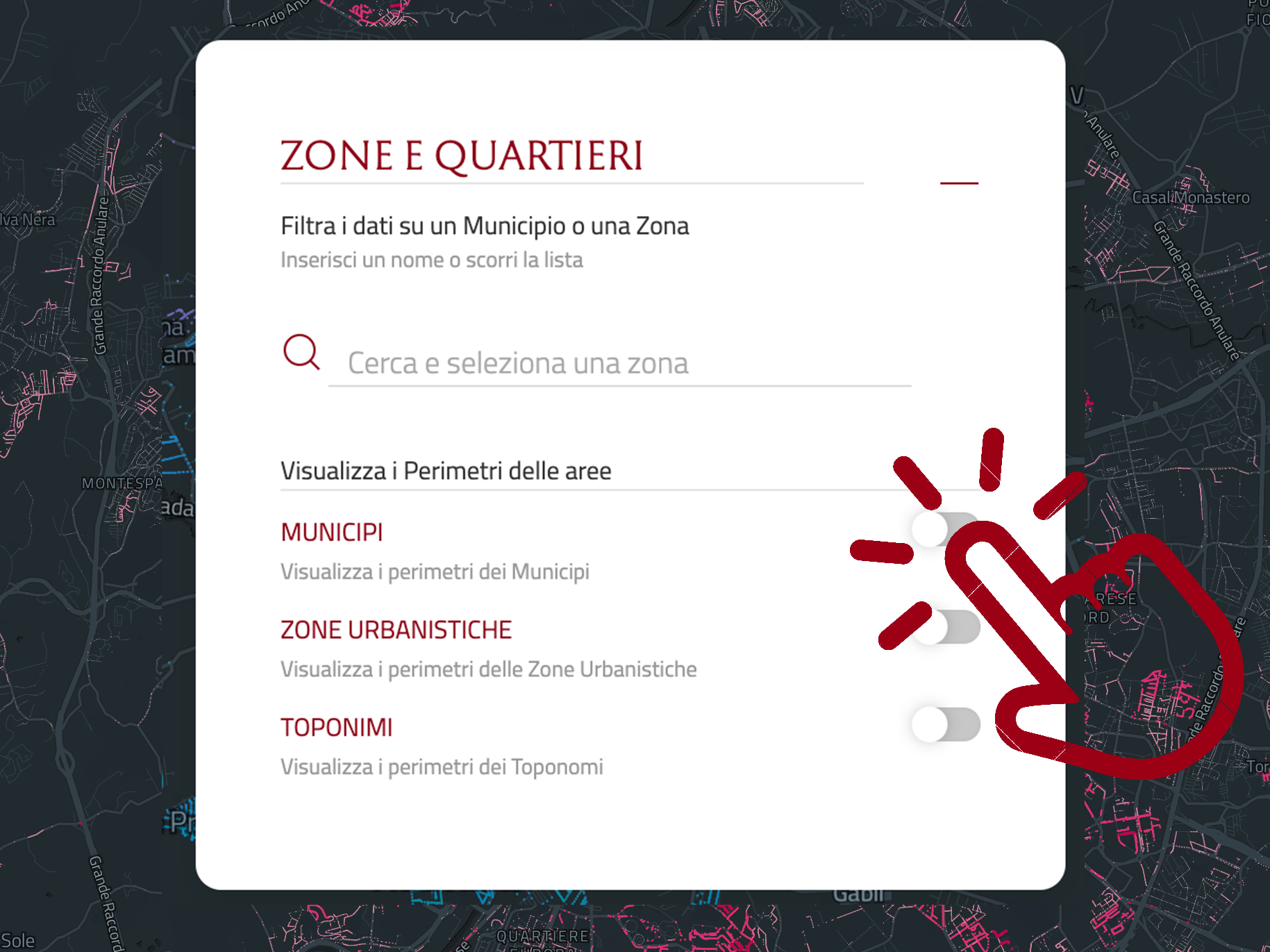 Puoi filtrare i dati per Municipio, Quartiere o zona urbanistica cercando il nome nella form di ricerca o visualizzare i loro perimetri