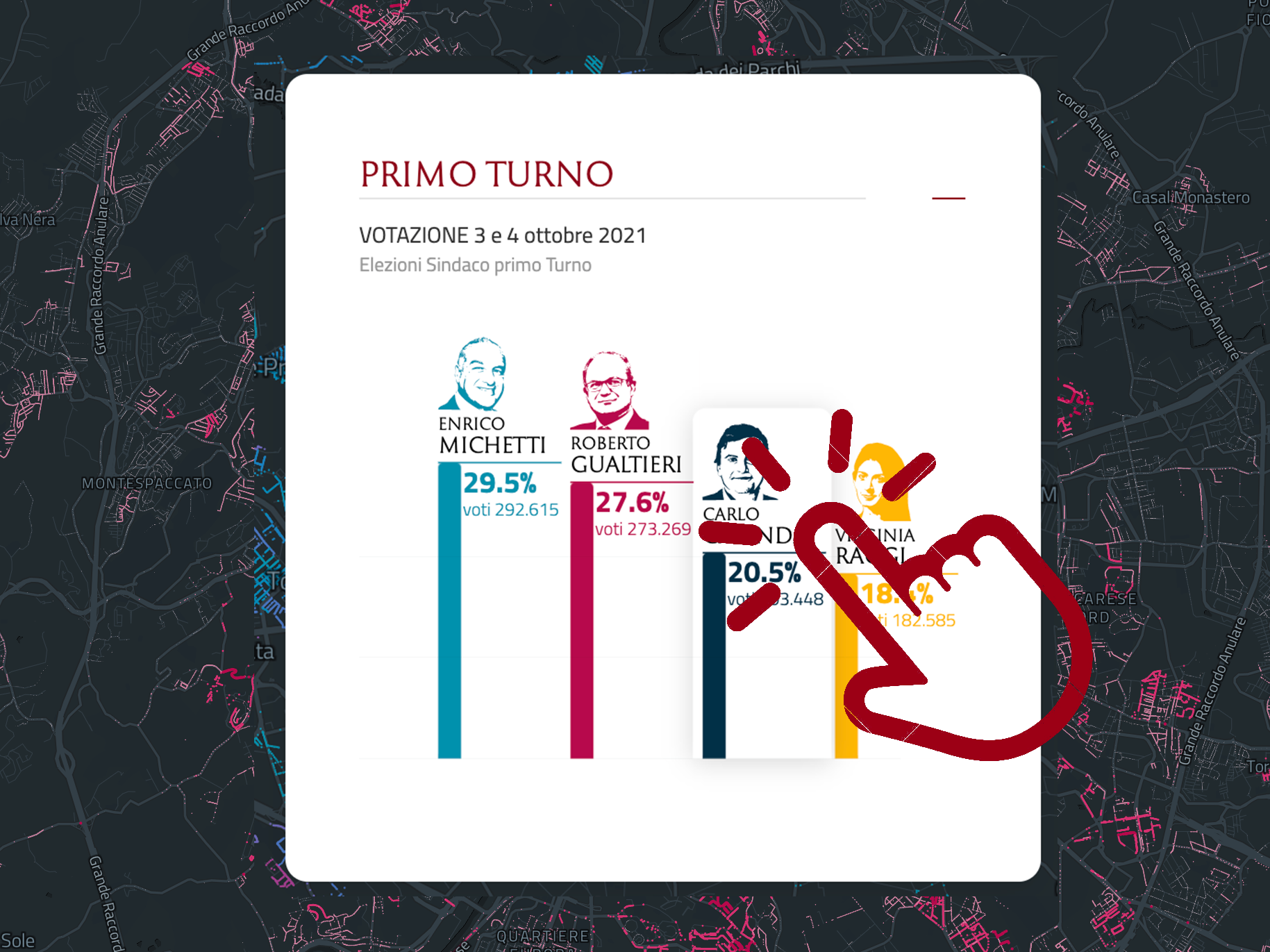 Cliccando sull'icona del candidato o della lista nei grafici delle tab, si attiverà la mappa tematica di quel candidato.