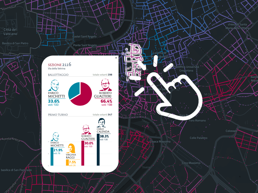 Scorrendo il mouse sulla mappa vengono evidenziate le sezione elettorali. Cliccando si aprira un popup con le informazioni di quella sezione